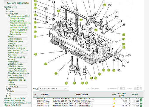 Kliknięcie w jakąkolwiek grupę przeniesie nas do całej grupy gdzie dany element występuje np. Mechanizm silnika D243 pokaże nam wszystkie podzespoły wchodzące w skałd silnika, czyli: Głowicę, Skrzynię korbową, Układ korbowo tłokowy. Z kolei kliknięcie w końcowy element (w tym wypadku w Głowica silnika i zawory) przeniesie nas już do schematu gdzie dana część występuje. Przedstawia to schemat poniżej.